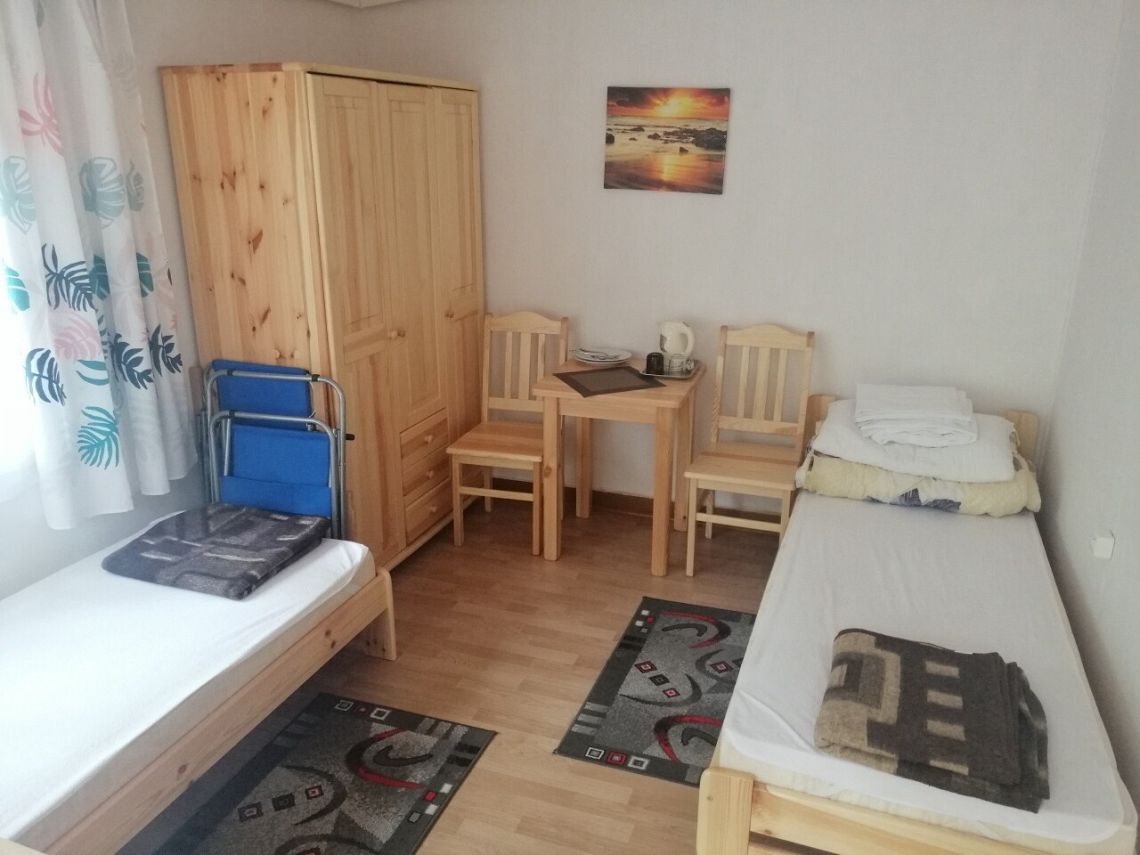 - w domku dla 3 osób: dwa jednoosobowe łóżka i jedna rozkładana wersalka.