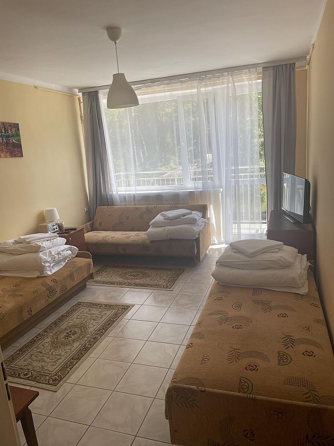 Pokój w budynku murowanym o powierzchni 16 m2, przeznaczony dla trzech osób. W środku znajdują się dwa pojedyncze łóżka 1 osobowe oraz jedna wersalka rozkładana 2 osobowa, szafa na ubrania, niewielki stolik kawowy oraz zestaw talerzy i sztućców dla trzech osób. Do dyspozycji Gości jest również czajnik elektryczny, radio oraz telewizor. Dodatkowo na wyposażeniu każdego pokoju znajduje się sprzęt plażowy (pled plażowy, parawan oraz dwa leżaki). Pokój posiada własną łazienkę wyposażoną w natrysk, toaletę i umywalkę. Obszerne okna, z balkonem zlokalizowanym na stronę północną lub południową zapewniają dużo światła dziennego. Wystrój jest prosty, bez zbędnych ozdobników lecz funkcjonalny.